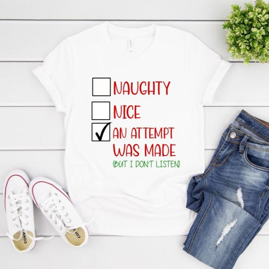 Santas Check List Christmas Shirt, Naughty, Nice, An Attempt Was Made (but I don't listen)